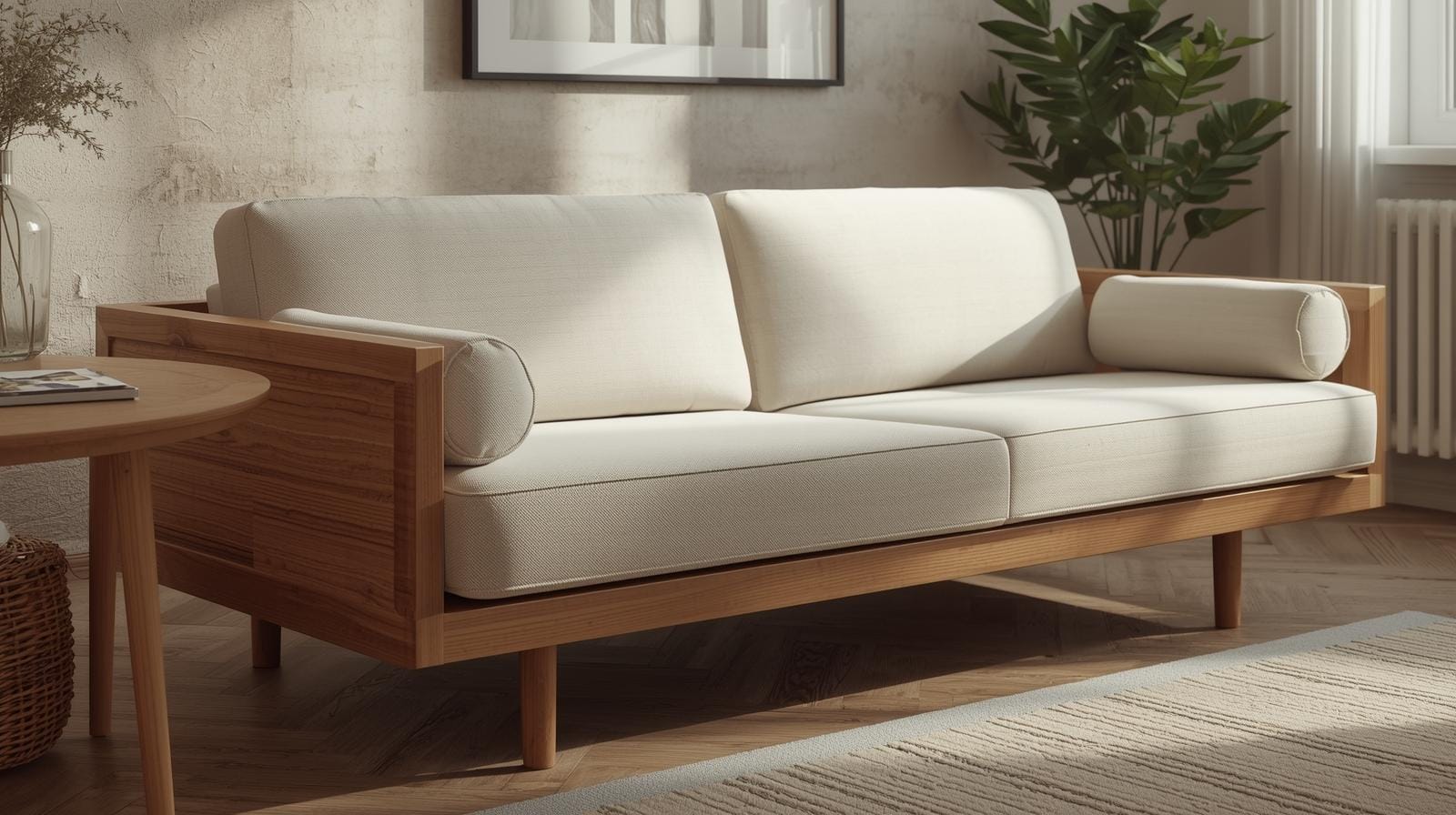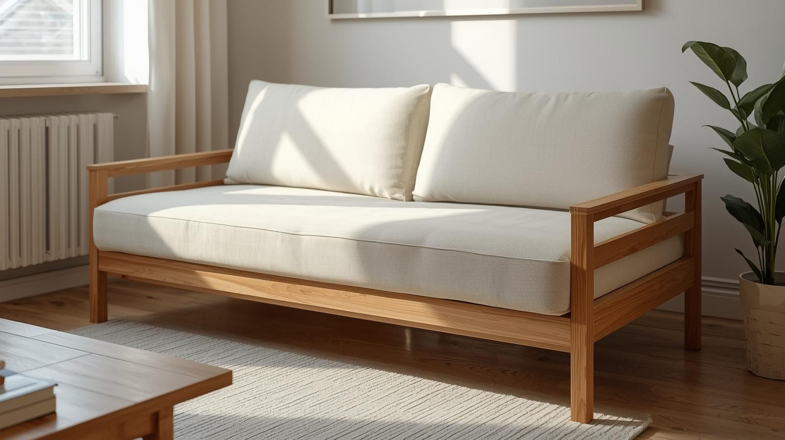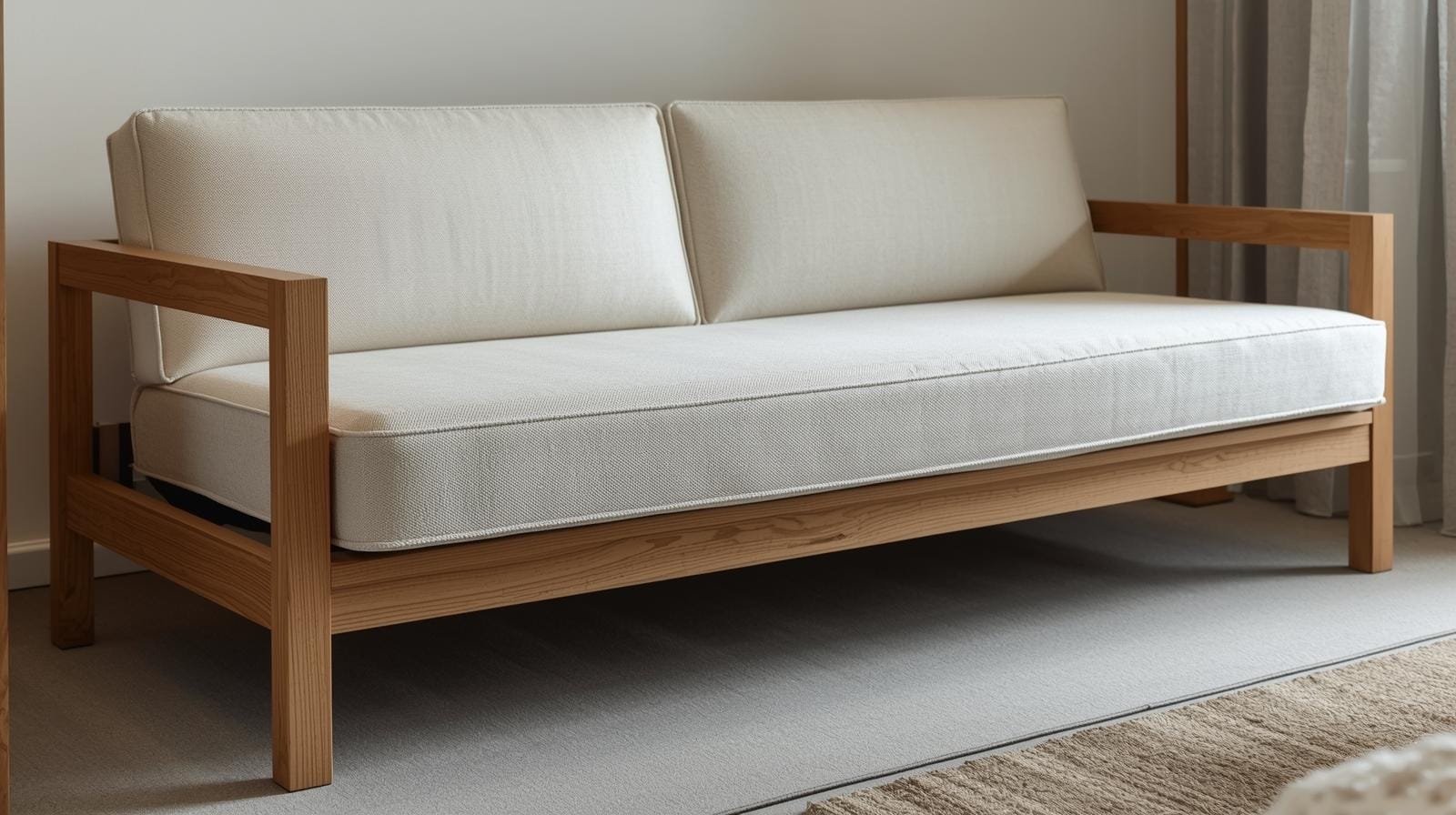 Sofa giường với đường nét gọn gàng, màu trung tính như trắng, xám, be, nâu gỗ.
