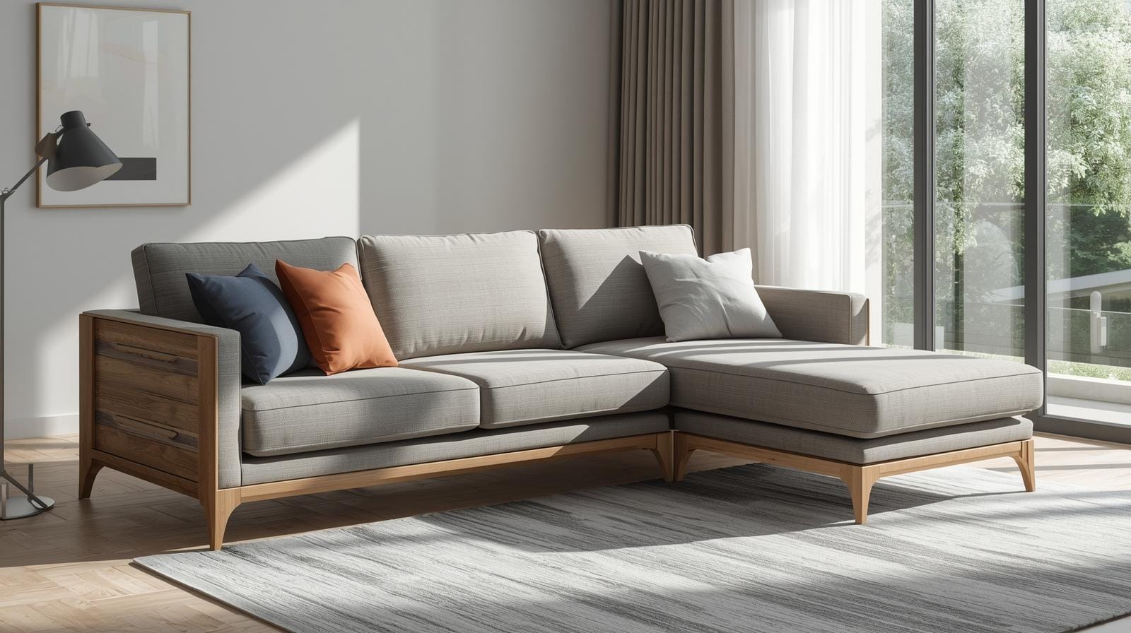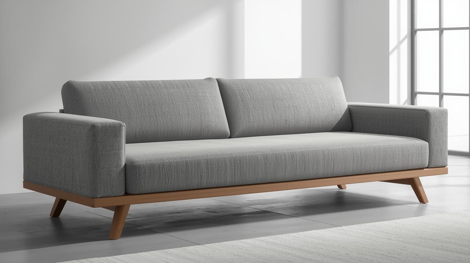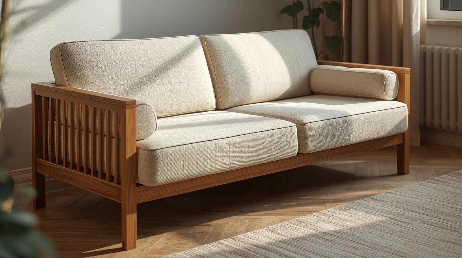 Sofa giường với đường nét gọn gàng, màu trung tính như trắng, xám, be, nâu gỗ.