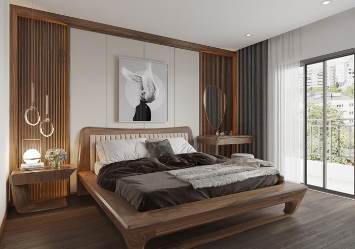 Xu hướng kết hợp vật liệu cũng ngày càng phổ biến, điển hình là sự kết hợp giữa gỗ óc chó và da hoặc nệm bọc cao cấp, tạo nên điểm nhấn độc đáo cho phòng ngủ. Ngoài ra, các gam màu trung tính như nâu trầm, xám và be tiếp tục được ưa chuộng vì dễ phối hợp với nhiều phong cách nội thất.