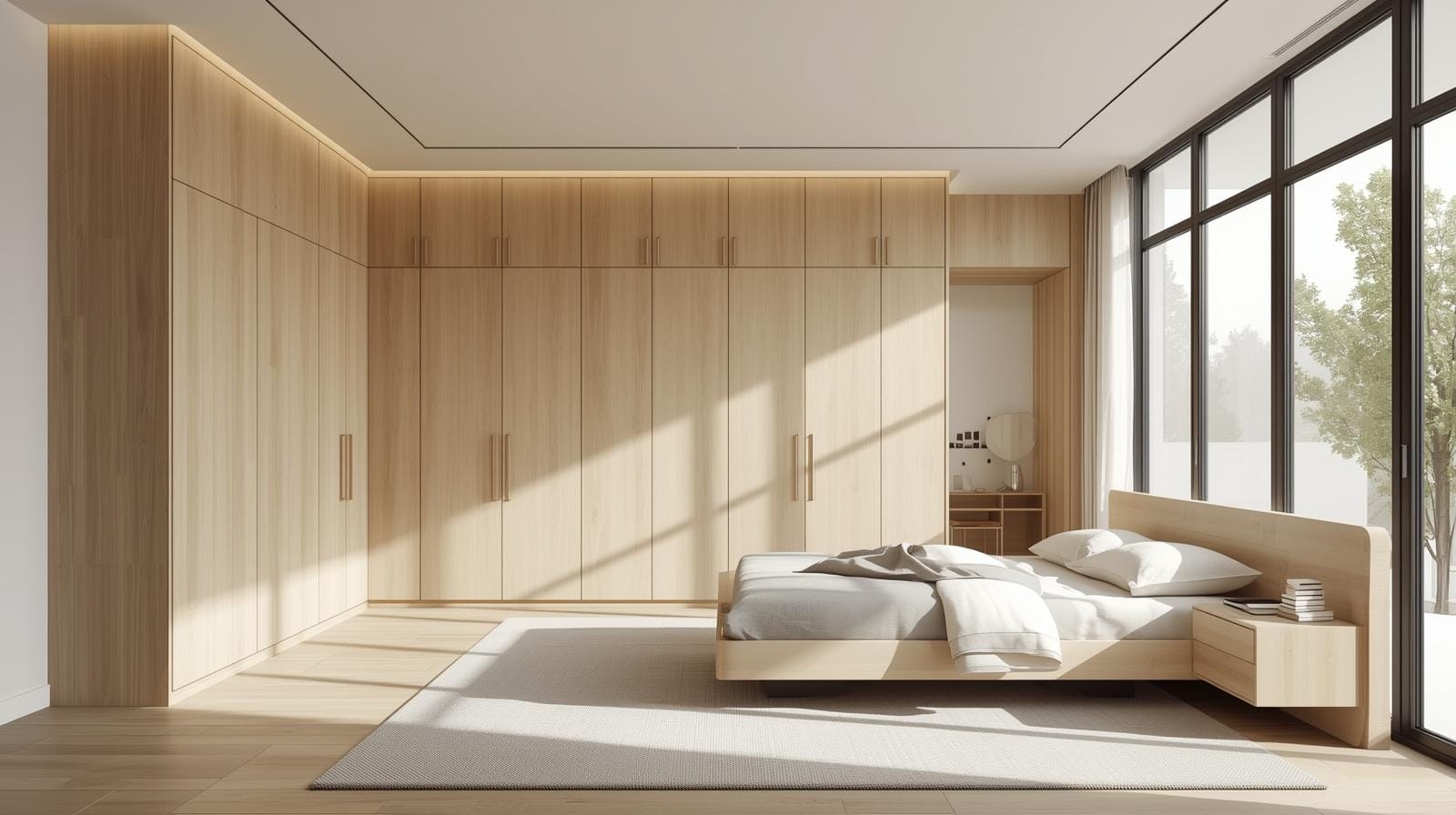 Giường ngủ thấp, tủ âm tường, ánh sáng dịu nhẹ.