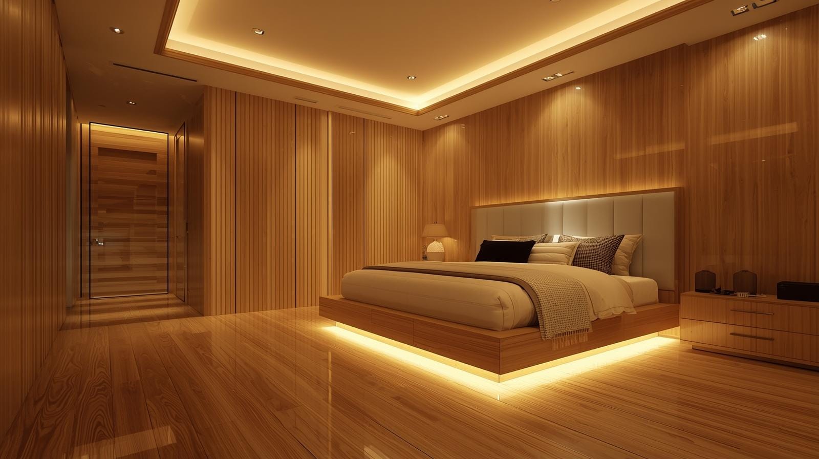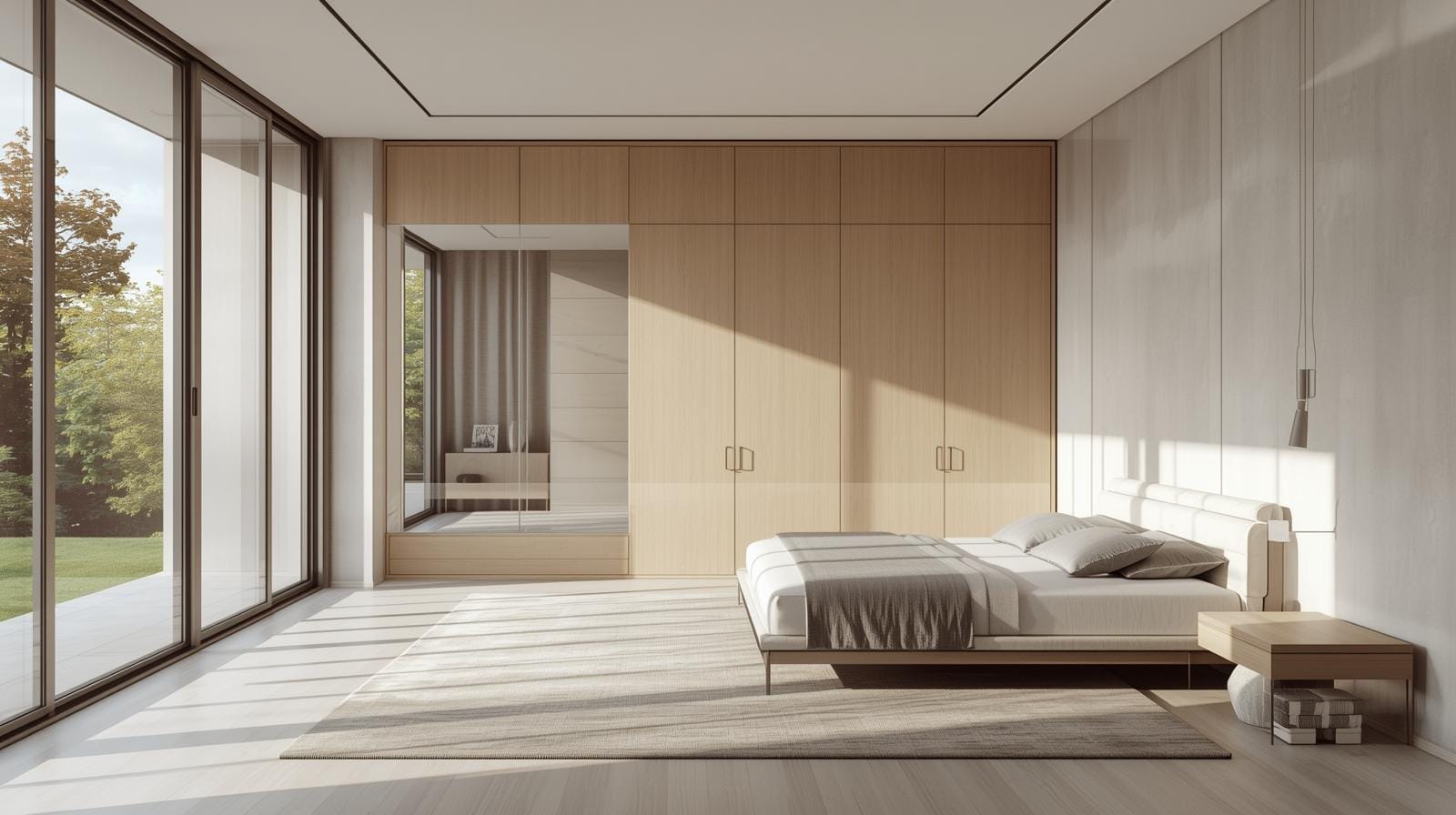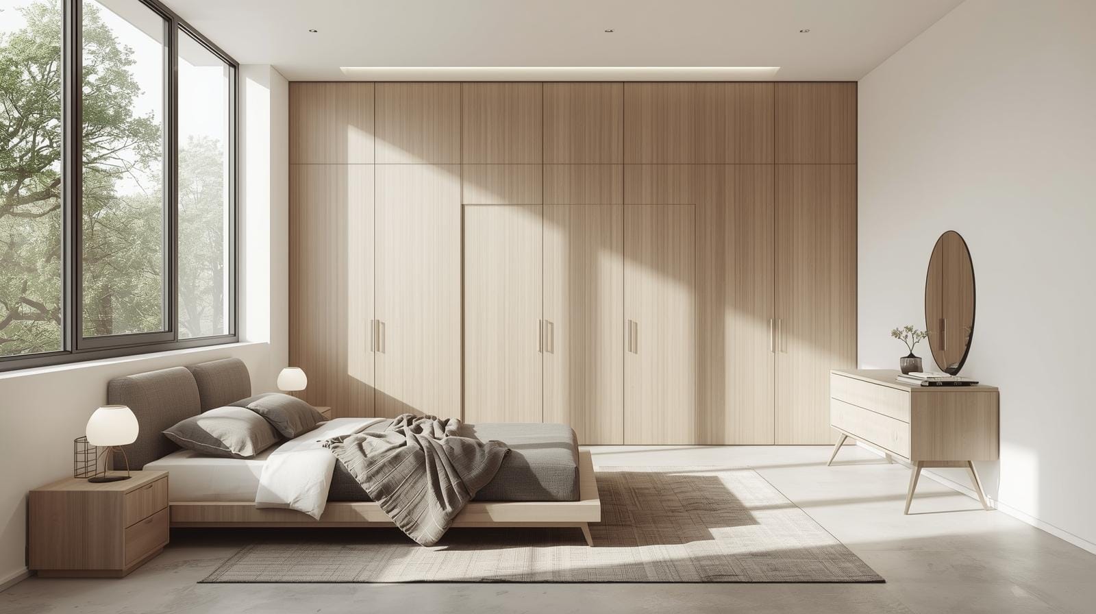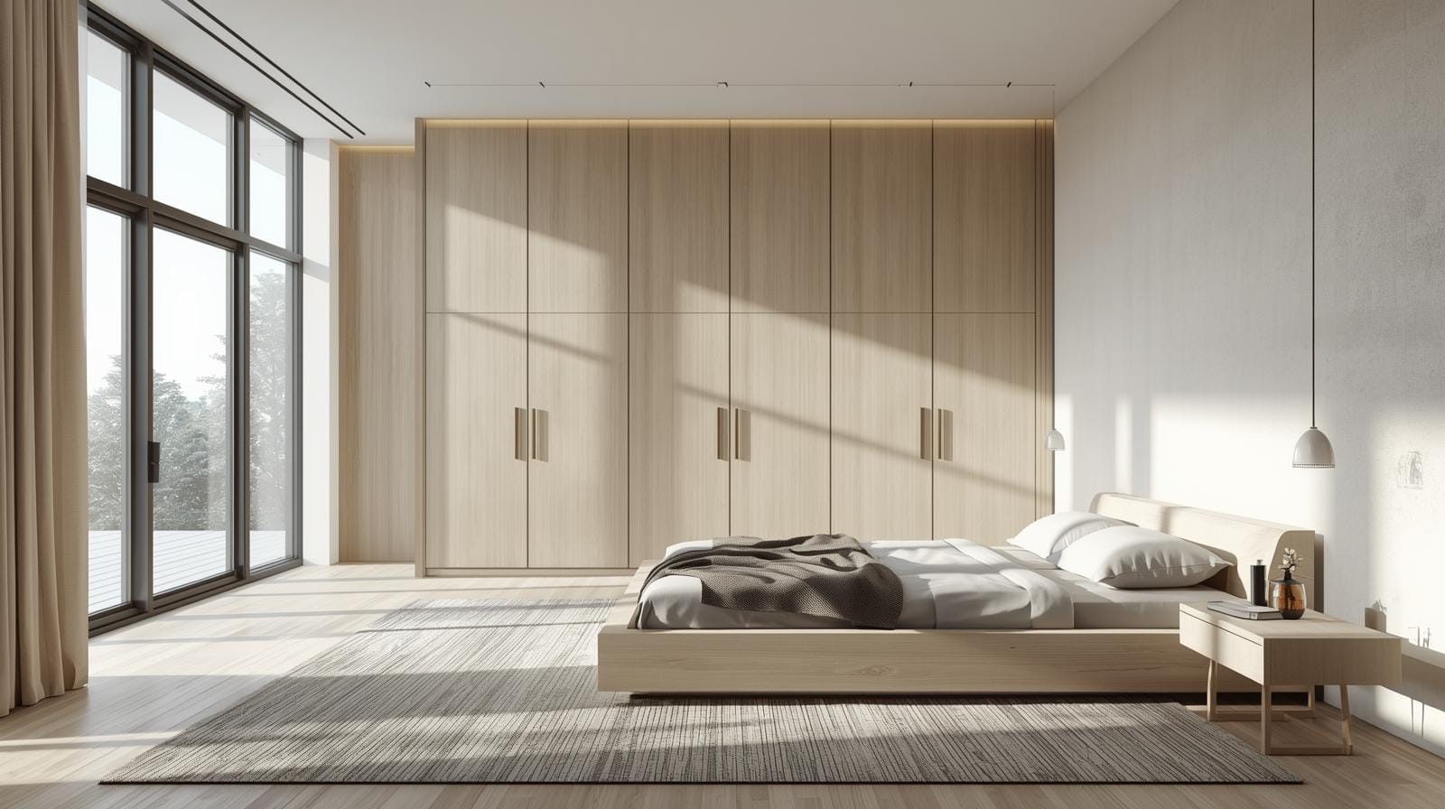 Giường ngủ thấp, tủ âm tường, ánh sáng dịu nhẹ.